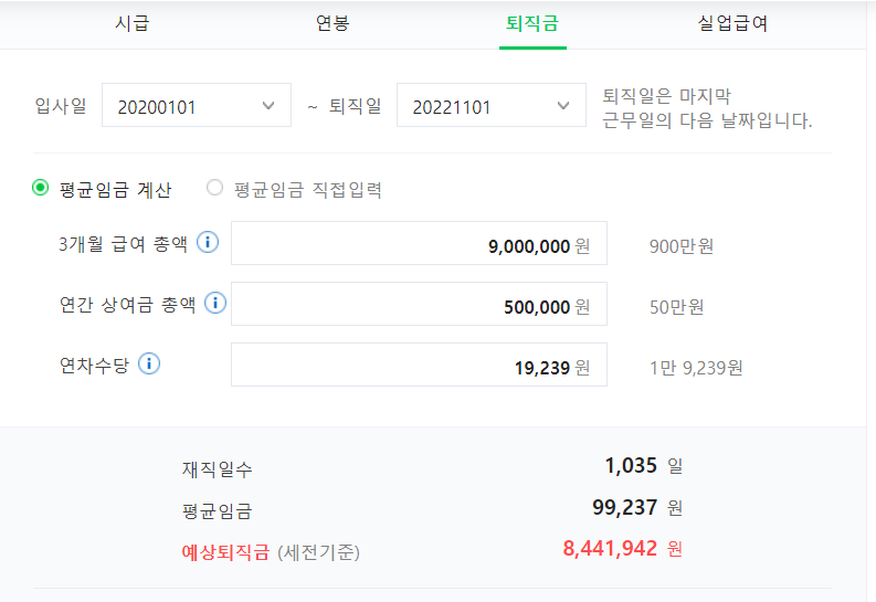 제가 생각 했을 때 네이버보다는 고용노동부에서 제공하는 퇴직금 계산기가 조금 더 정확하게 계산되는 것 같은데요